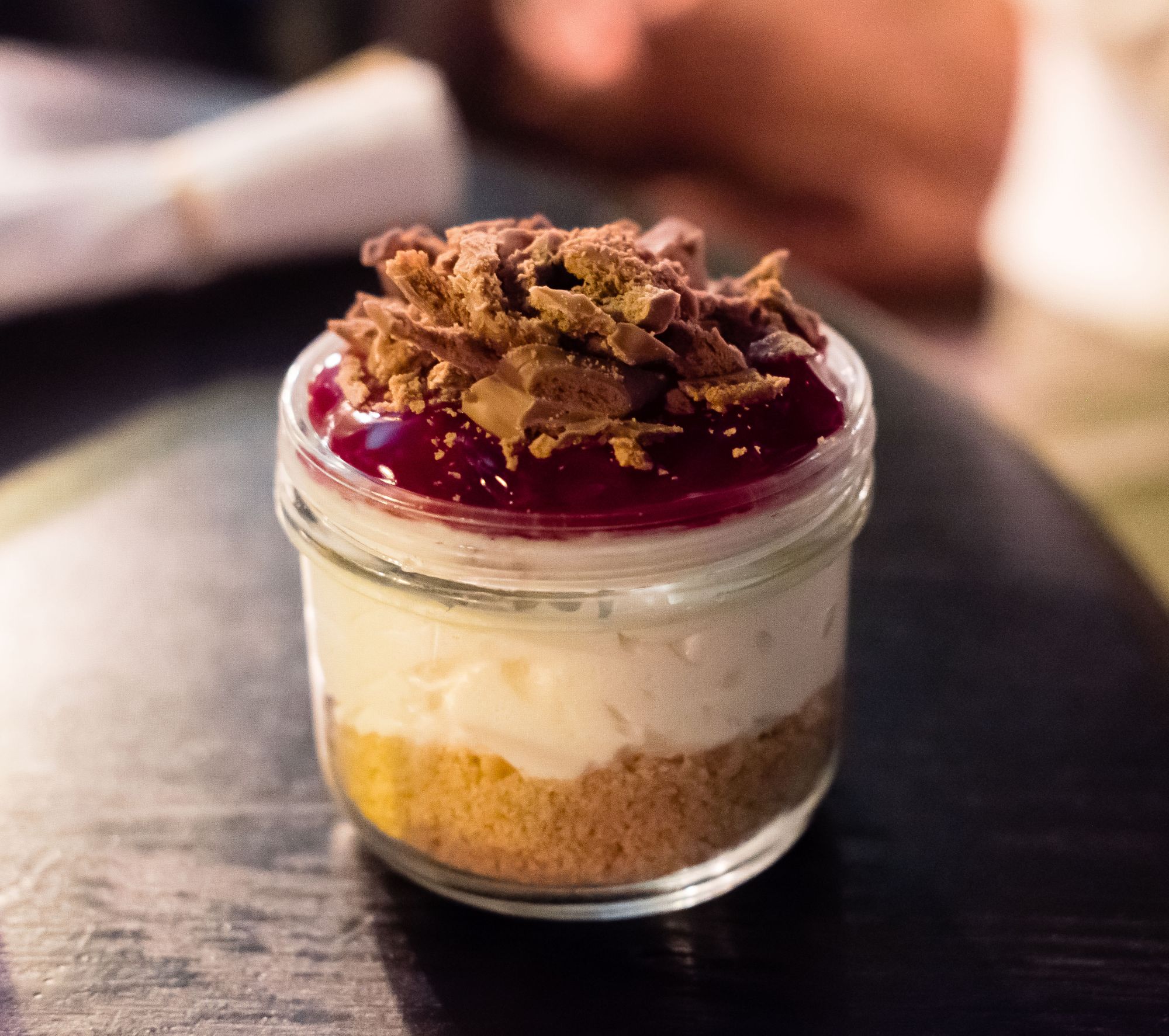 For dessert, I enjoyed the no-bake raspberry cheesecake. This was a throwback to the 80s-style of Cool Whip in place of real cream in jarred desserts. Thankfully, there's no Cool Whip in this cheesecake, but there is a ton of whipped cream which had a mousse-like texture as I cleaved my dessert fork through. The chocolate crumbs and raspberry jam on top made for a decadent look on this dessert.