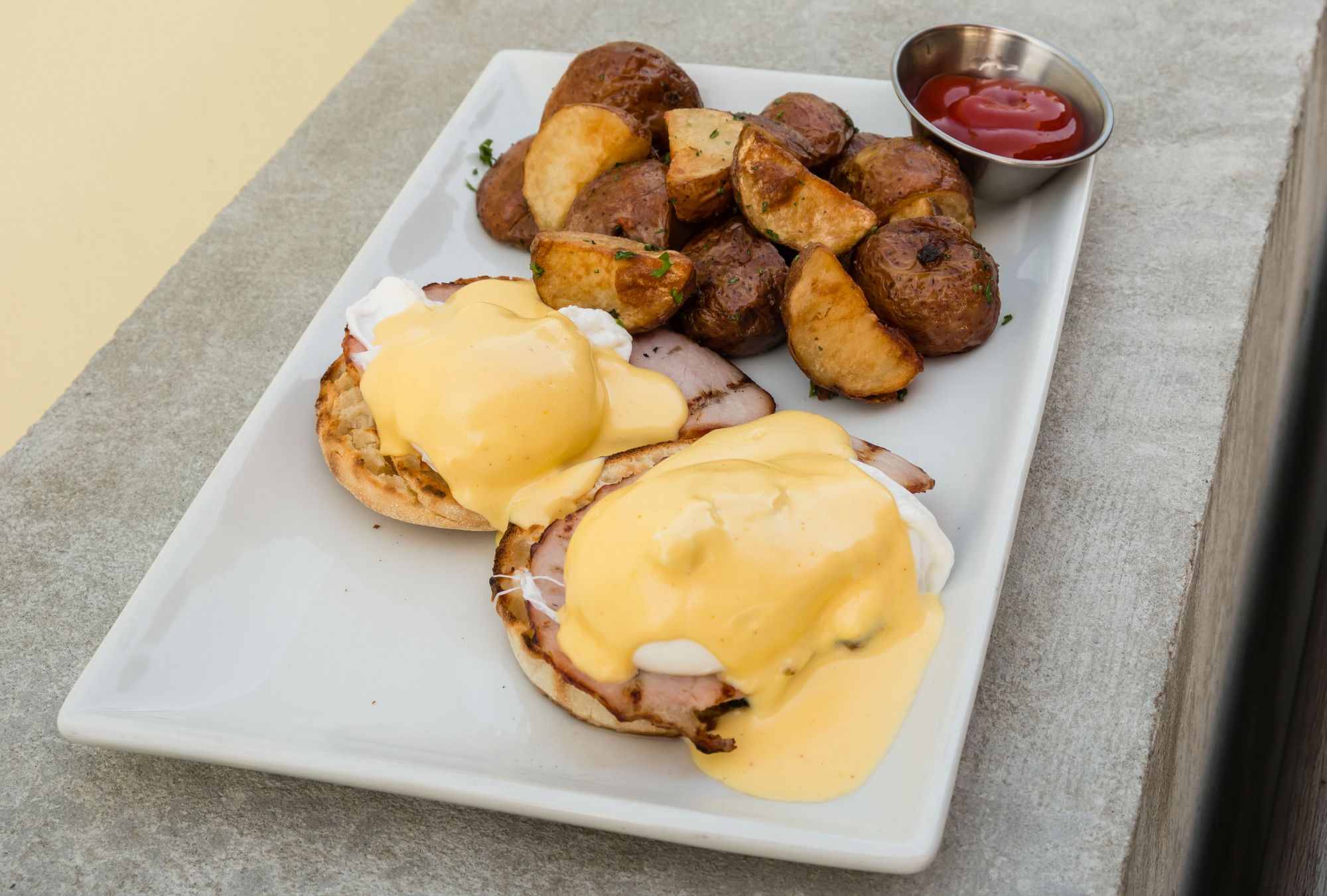 I'm a big fan of benedicts so I was thrilled to see a few benny options on the menu. A noticeable absence for some benny aficionados is smoked salmon which didn't bother my preferences too much. I opted for the CB Benedict which stood for "Canadian Bacon" Benedict. This featured back bacon, poached eggs, and house-made hollandaise sauce perched on a toasted English Muffin. New potato hash browns rounded out the plate. The poaching on these eggs was superb. I could take my fork and pop the yolk out with almost zero effort. The hash browns were my preferred way of serving potatoes. Each one was plump, well-seasoned, and fluffy on the inside. The hollandaise, though house-made was quite biased on the savoury side. I personally prefer a little bit of thyme, dill, any herb really, to add some depth to my hollandaise, but won't complain too much as this benny sits on the more regular tier of brunch dining.