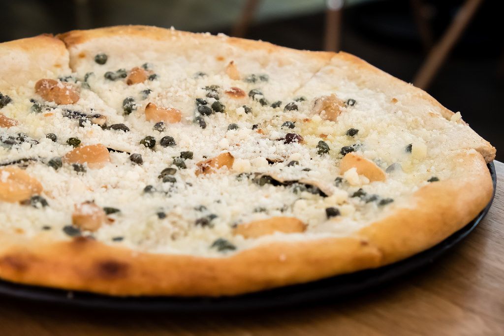 For pizza, we opted for the puttanesca bianca pizza. This was topped with bianco sauce, capers, white anchovies, roasted garlic, and fior di latte. Anchovies get a bad rap on most childrens' cartoons these day but they can be pretty delicious on pizza. The tang of the fish was a great complement to the roasted garlic. I normally love capers, but I found the capers here to be on the saltier side. If you're outwardly averse to salt, you might find you'll enjoy this pizza more after removing a few pieces of capers. Otherwise, the crust here was fantastic. The photo below doesn't do it justice, but this crust was razor thin, yet still retained some sourdough chew as opposed to caving into brittle cardboard. All the toppings stayed on each slice with no problem.