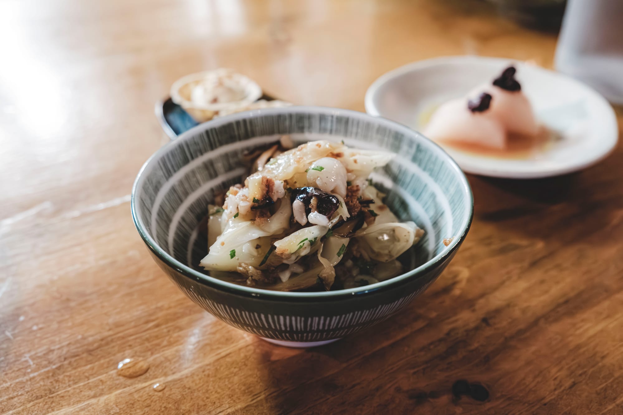 The charred cabbage salad, daikon umeboshi, tartlet with chutney, and tater tot came as a petit-fours to whet the taste buds and begin the escalation into vegan nirvana. Little bites of vegan heaven to kick things off. That cabbage salad had this crunchy, smoky goodness that had me hooked from the start.