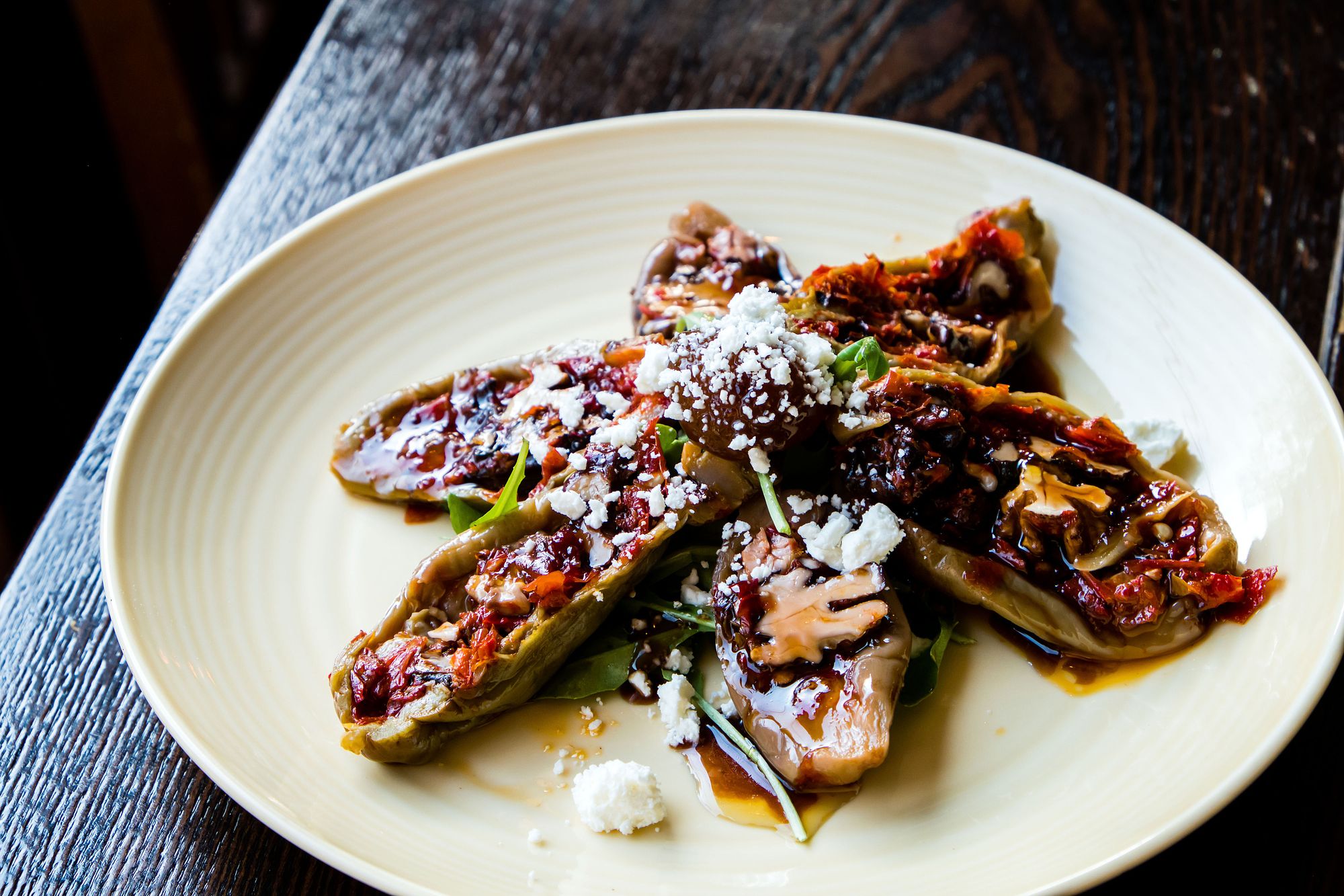 Another appetizer we had were the stuffed aubergines. These were laden with walnuts, red pepper, arugula, pomegranate molasses, apricot confiture, and feta to make for another sweet and savoury start to a meal. Because of the pickled flavour of the aubergine and the viscous pomegranate molasses, this was a pretty intense flavour profile. I would order this if I were dining with 4 or 5 other friends so we could all enjoy one aubergine each to jumpstart our taste buds.