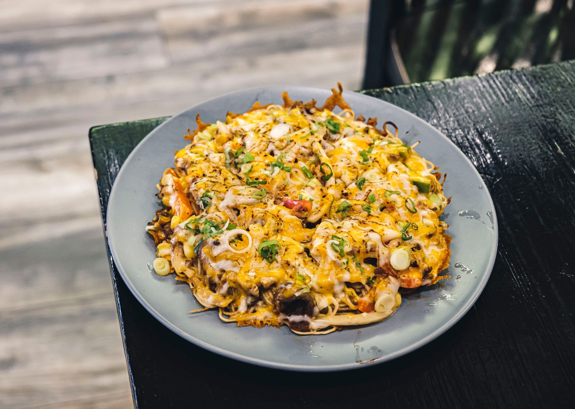 Next up was the bulgogi ramen pizza which was a very original creation. I was most curious as to how ramen would serve as a base for pizza. If you've ever had Chinese-style crispy fried noodles, a similar concept is applied here. The base of the pizza is a body of fried noodles, in the middle is a juicier layer of more noodles, and on top is a mix of bulgogi (beef), cheese, peppers, and onions. I'm pretty sure this is a one-of-a-kind item as far as pocha food in Vancouver, and it's probably made its appearance at Ramen Koika because Koika prepares their noodles on-premises meaning they can tweak the recipe as needed.