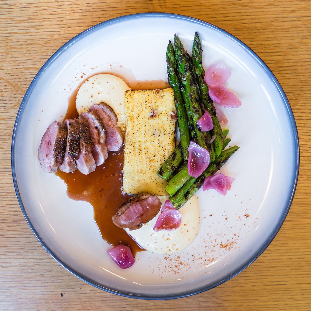 Onto the mains, first up was the duck breast. This was plated with chorizo polenta, corn cream, apache onion, and cranberry sauce. This was a delicate dish that reminded me of a fancy Thanksgiving dinner (for people who can afford to feed everyone duck). The asparagus had a wonderful crunch and the flab of chorizo polenta was full of complementary flavour for the duck breast which was cooked perfectly, leaving it supple and juicy.