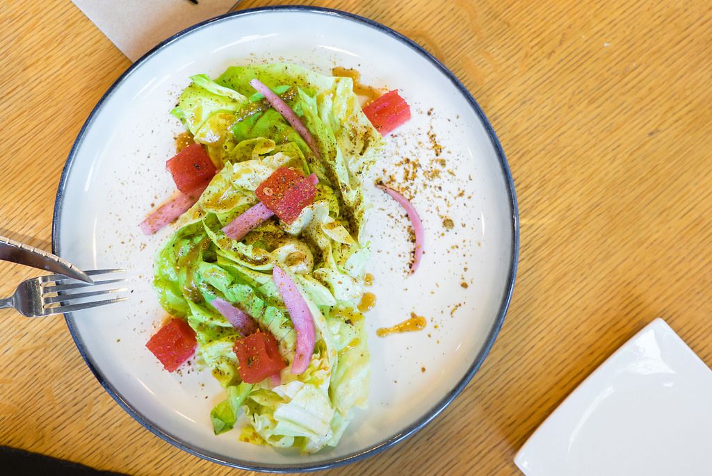 The pistachio salad was a Boston lettuce salad with watermelon, pickled vegan feta cheese, pistachio dressing, and shiso pistachio powder. Nutty flavour aside, this salad was a very cool concept with lots of texture and flavour. Watermelon and pistachio, write that combination down.