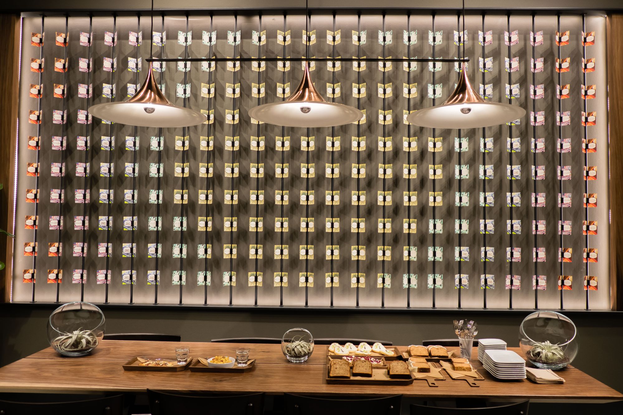 Here you'll find a gorgeous interior with lots of strong design accents and a stellar wall of coffee labels on the back wall that looks pretty impressive. I can't wait to see students flock in and cover the tables with a layer of textbooks and laptops.