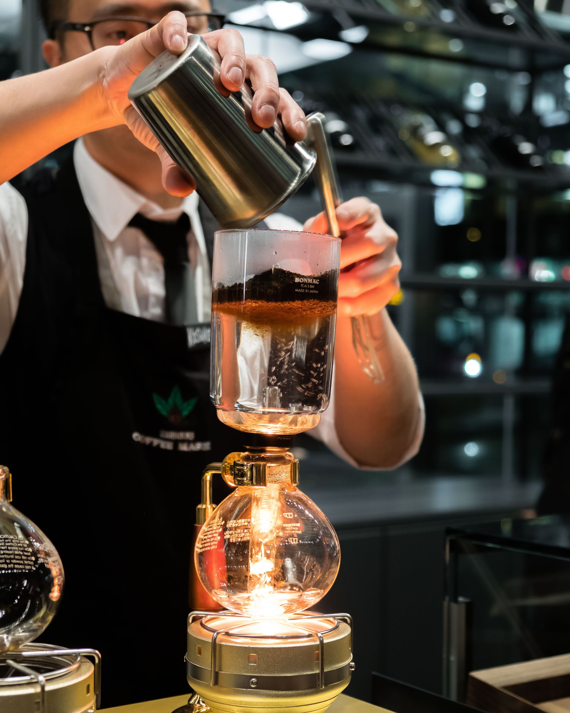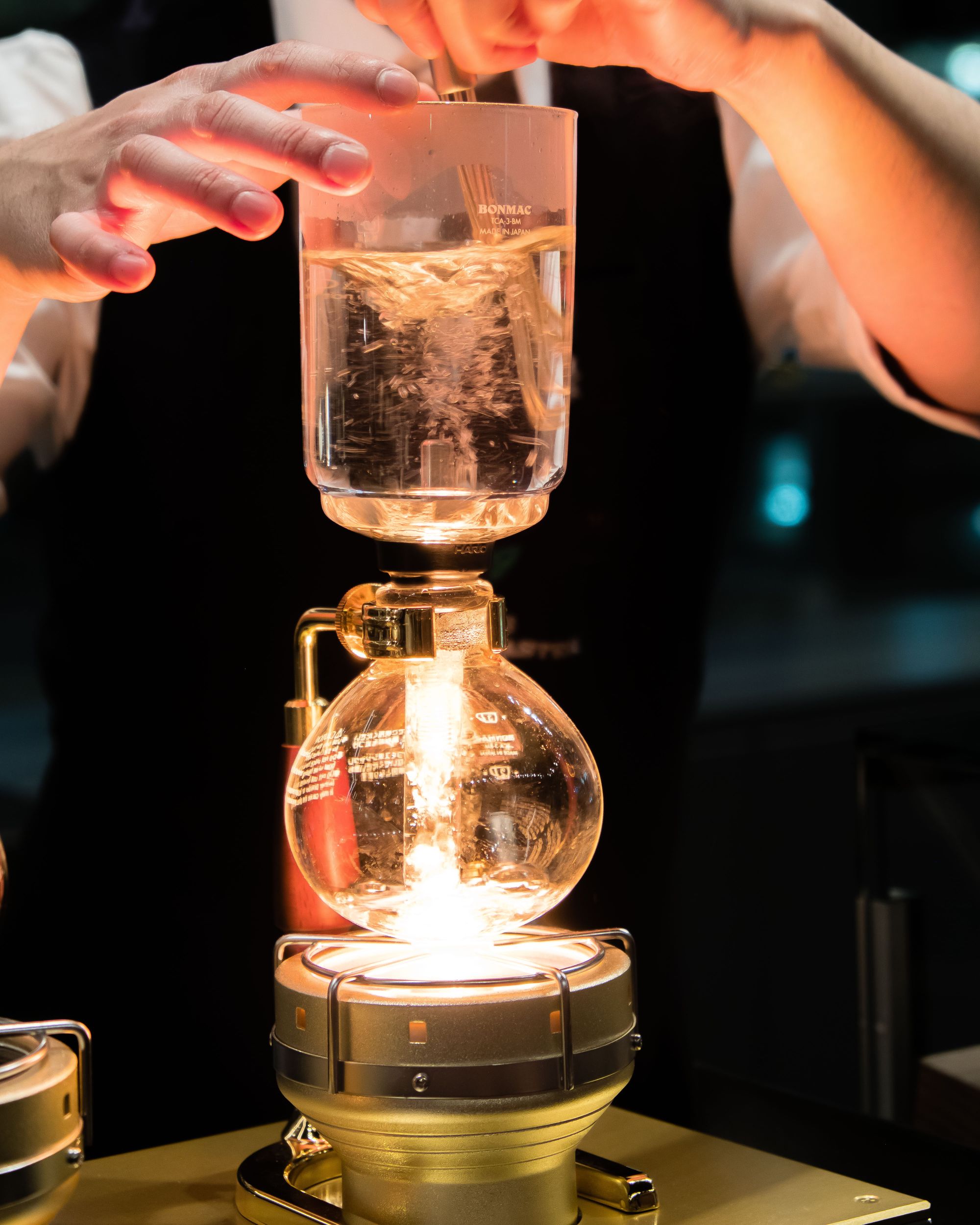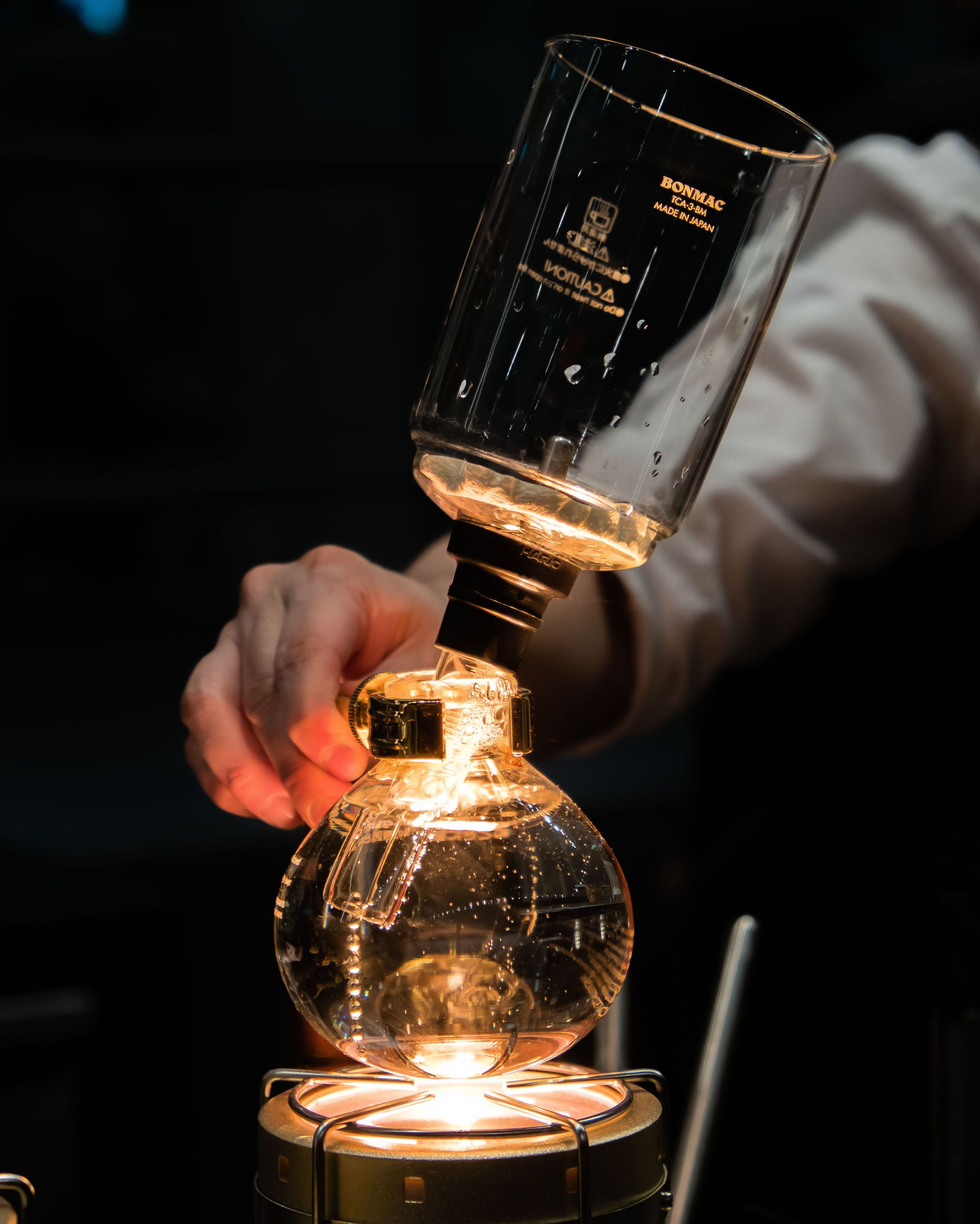Once the water heats up, an upper vessel with a coffee filter is added on top, tilted at an angle to let the water continue to heat freely.