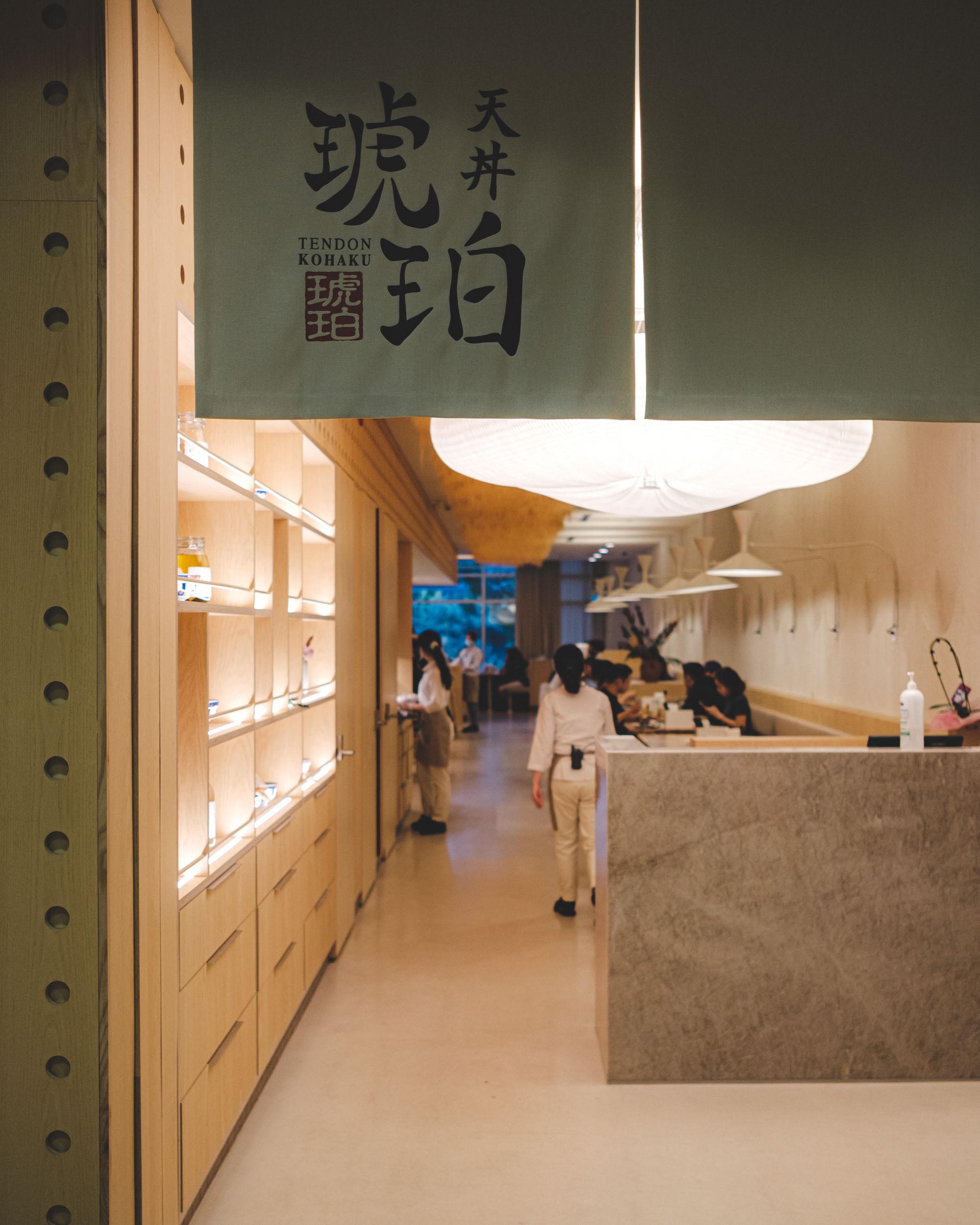 Tendon Kohaku in Burnaby occupies a narrow space that then turns into an L-shaped restaurant with a window facing Lougheed Highway. Light woods, ridged walls, and fluffy ceiling decor give the space an intense feeling of texture and layering. I wouldn't fault you for thinking this was an interior furniture store until you saw the kitchen staff pumping out tendons. There's seating for about 80 guests during this time. It's not extremely loud inside but you are definitely close enough to hear your neighbours' conversations if your table gets a little quiet.