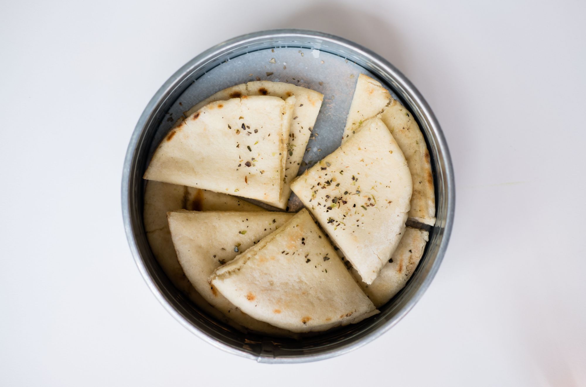 From the Mezzethes (Greek-style tapas) menu we had the saganaki, a breaded pan-fried mountain sheep cheese with pita. If you've never had deep-fried cheese before, The Greek Gastown might be just the place to order some. This cheese cut like a German schnitzel but was completely meat-free. Using my knife, I would make small cuts to eat with the paired pita. The pita, by the way, was excellent. This pita released a light stream of steam indicating its freshness out of the kitchen. The herbs on the pita were simple but gave it a little extra oomph making it a great vessel to transport the saganaki into my mouth.