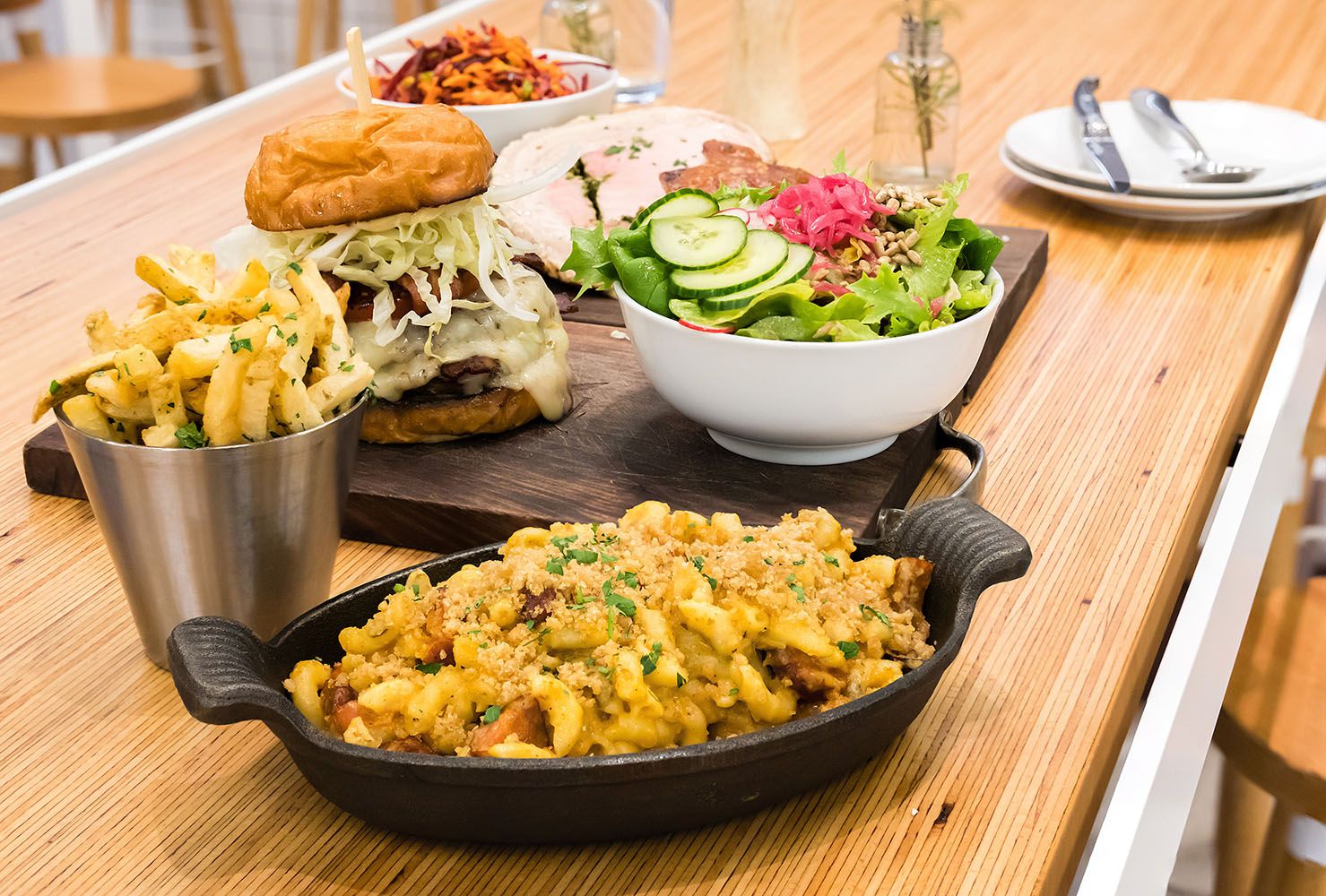 The boss burger was what I was looking forward to most for this meal. Featuring a staggering tower of double 65-day dry aged beef patties, double aged cheddar, double bacon, charred tomato, zucchini pickles, iceberg lettuce, and white BBQ sauce served in a brioche bun, this was a monster to hold and a pleasure to bite into. The 65-day dry aged patties had a slight blue cheesiness to them with all of the ageing they'd been put through (locally on premises, I might add). The mix of cheese and bacon with the white BBQ sauce was a divine combination, and I'd highly recommend going all out and splitting with a friend if you're afraid of finishing this by yourself.