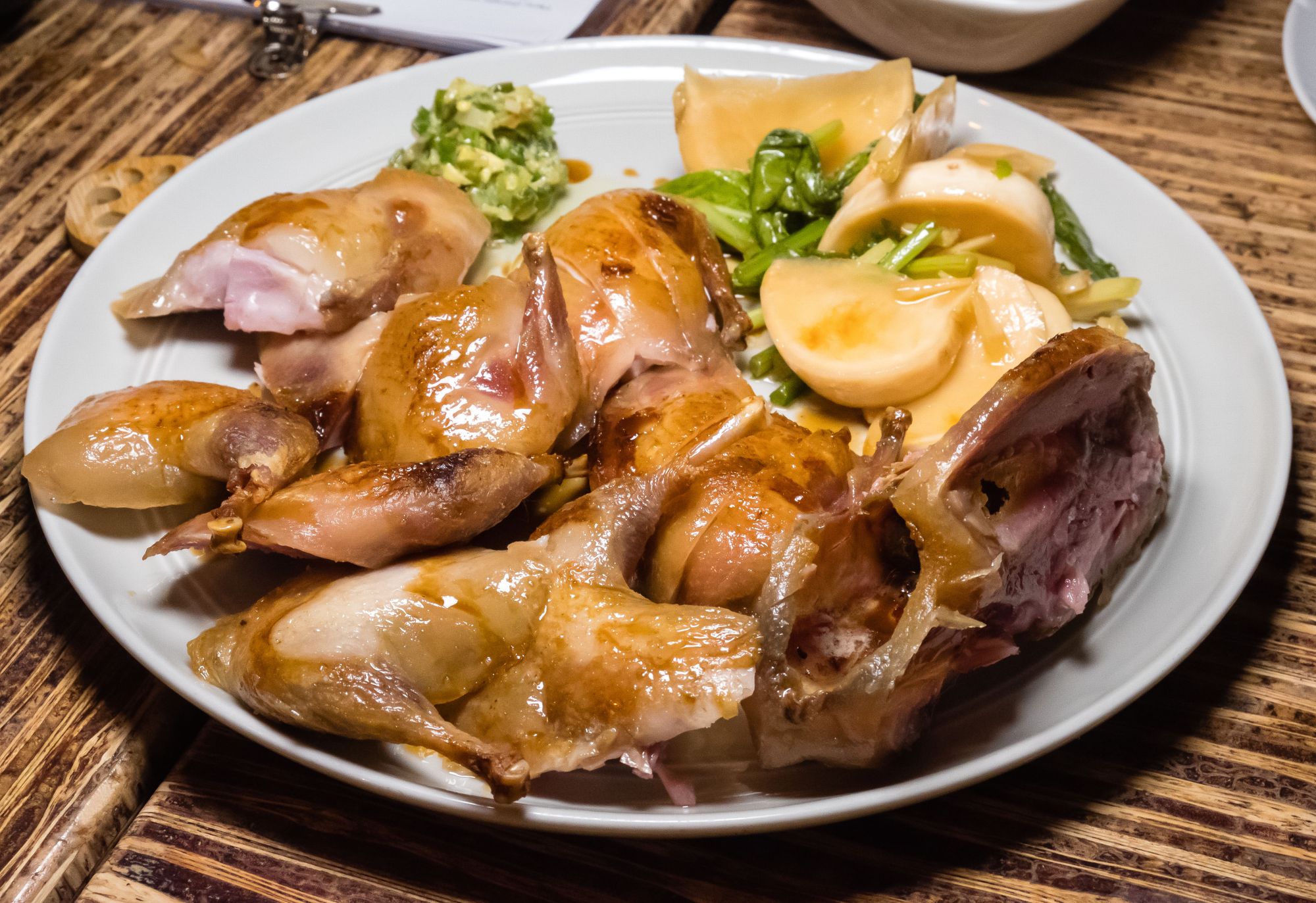 Our other main was the 3 week dry-aged whole quail. I've been to enough lackluster Dine Out Vancouver menus to expect the tiniest quail to be served. To my surprise, our quail(s) were anything but tiny. Served with pickled turnip (the 6th and last pickles of the night) and ginger scallion, this was a flavour explosion with lots of dry age concentration on the quail meat. Each piece had a wonderfully crisp skin, layer of buttery fat, and an intense wedge of meat that had hints of blue cheese (though nothing as insane as 67-Day Dry Aged Burger from Crowbar). I'd had quite enough of pickles by this point but it was fun biting into the giant chunks of pickled turnip.