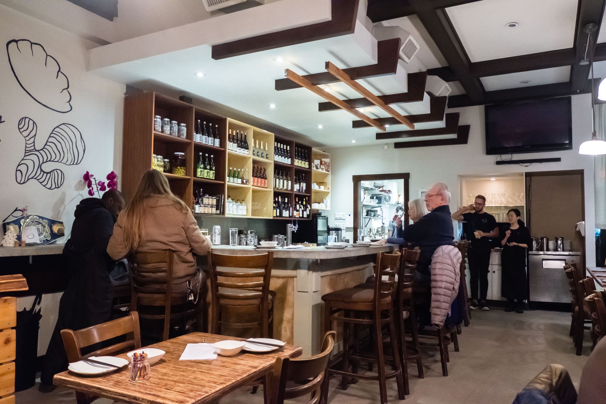 Ugly Dumpling takes up residence where the former Merchants Workshop lived until it closed. During the winter month when we visited, it looks like the patio was closed. Inside, the lighting is dim and the vibe is a mix of both relaxed and higher class (see all the wine, sherry, and sake bottles behind the bar). There's seating for about 60 guests at the bar and at dinner tables. The blinds are all shut inside so people watching (and the reverse) is not much of an option during winter.