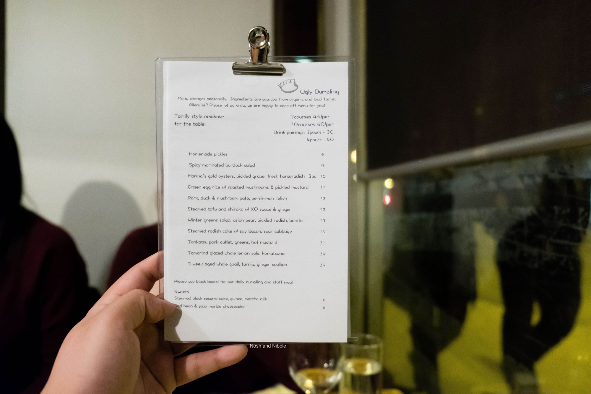 Service started off great at Ugly Dumpling though finished a little weak. Our server was on point with describing all of the dishes as they came to us and kept us informed on how many dishes were left in our itinerary. Towards the end the gaps between courses widened and I could feel myself getting complacent. The restaurant was also getting busier at this time so it would appear load was a limiting factor for the kitchen this night. It took us roughly 3.5 hours to finish our 10-course omakase that started at 5:30pm.