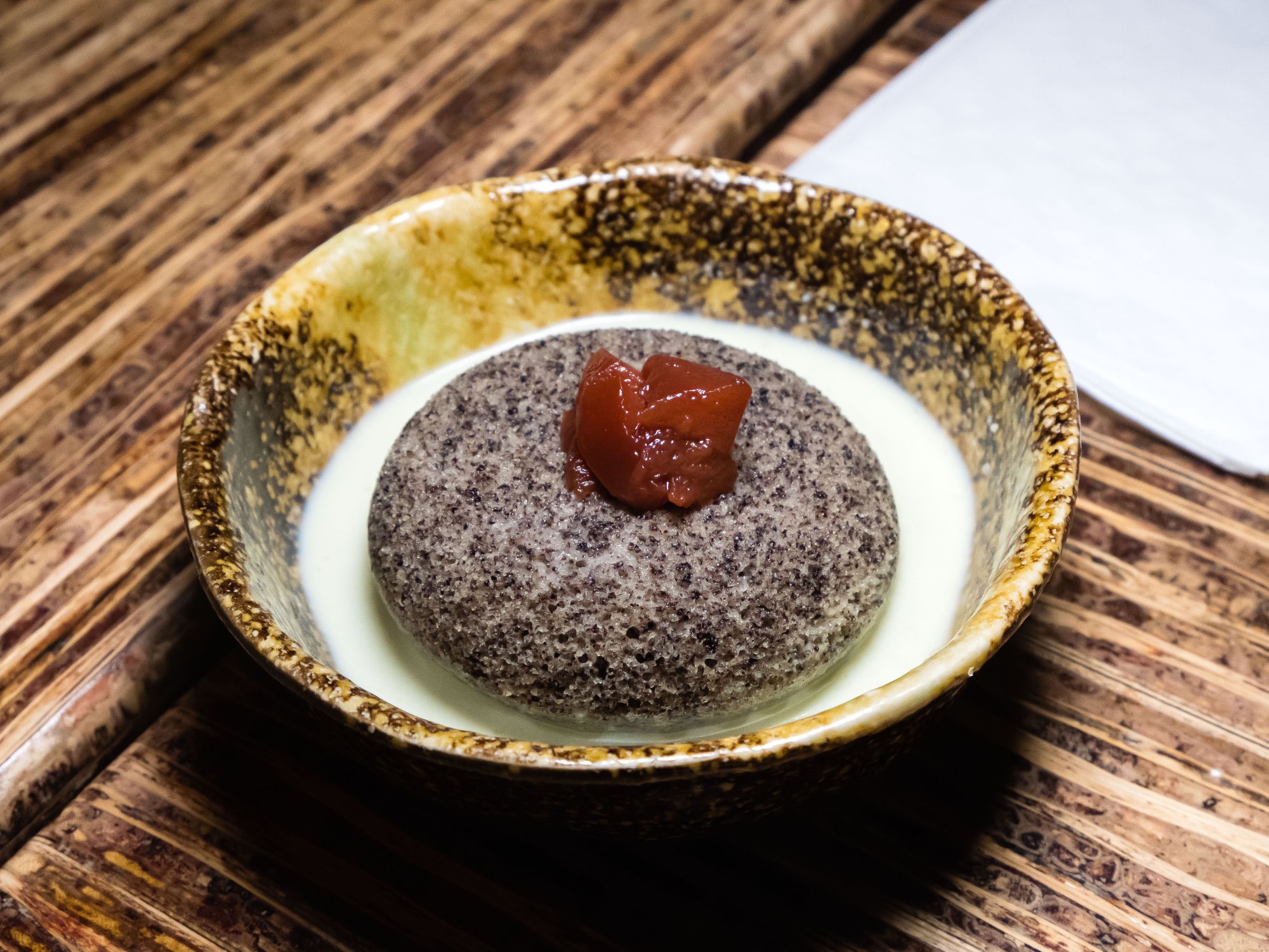 For desserts, we were simultaneously served two sets of steamed black sesame cake and red bean & yuzu marble cheesecake. I loved the matcha milk served with the sesame cake but wish it was more intense. The cake was wonderfully moist and I'd recommend it out of the two desserts.