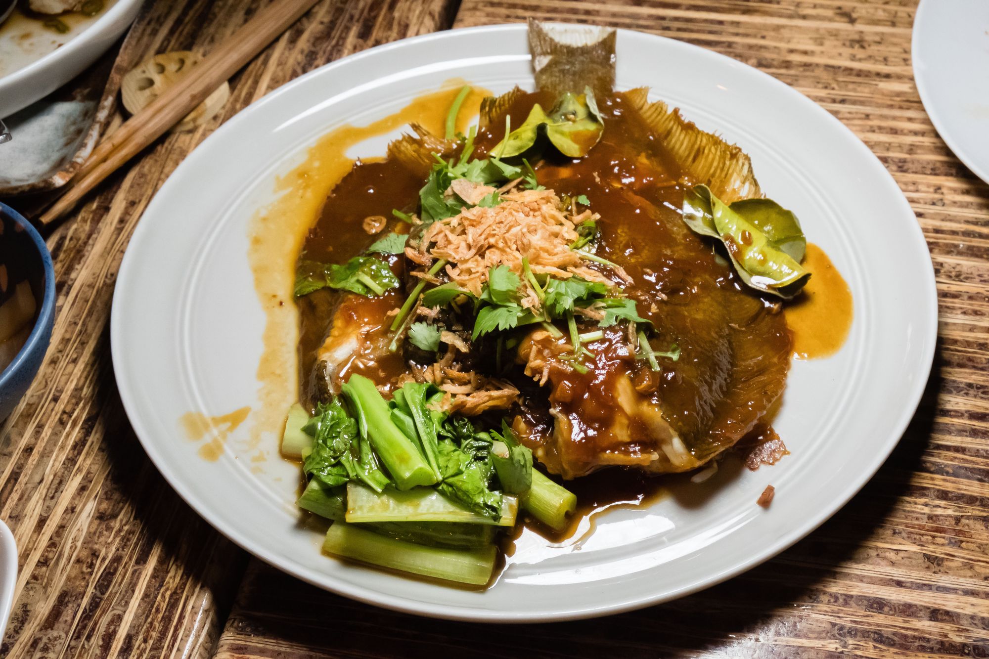 The tamarind-glazed whole lemon sole was a beautiful flat fish served with the stalks of Japanese spinach (komatsuna). The fish had a great taste yet it was a whimsical chore prying the fish from the bone here. Luckily we had a fish master at our table, Picky Diner, who managed to separate much of the fish meat from bone in a couple of minutes. The fish was cooked just right, providing lots of meatiness in its thin profile.