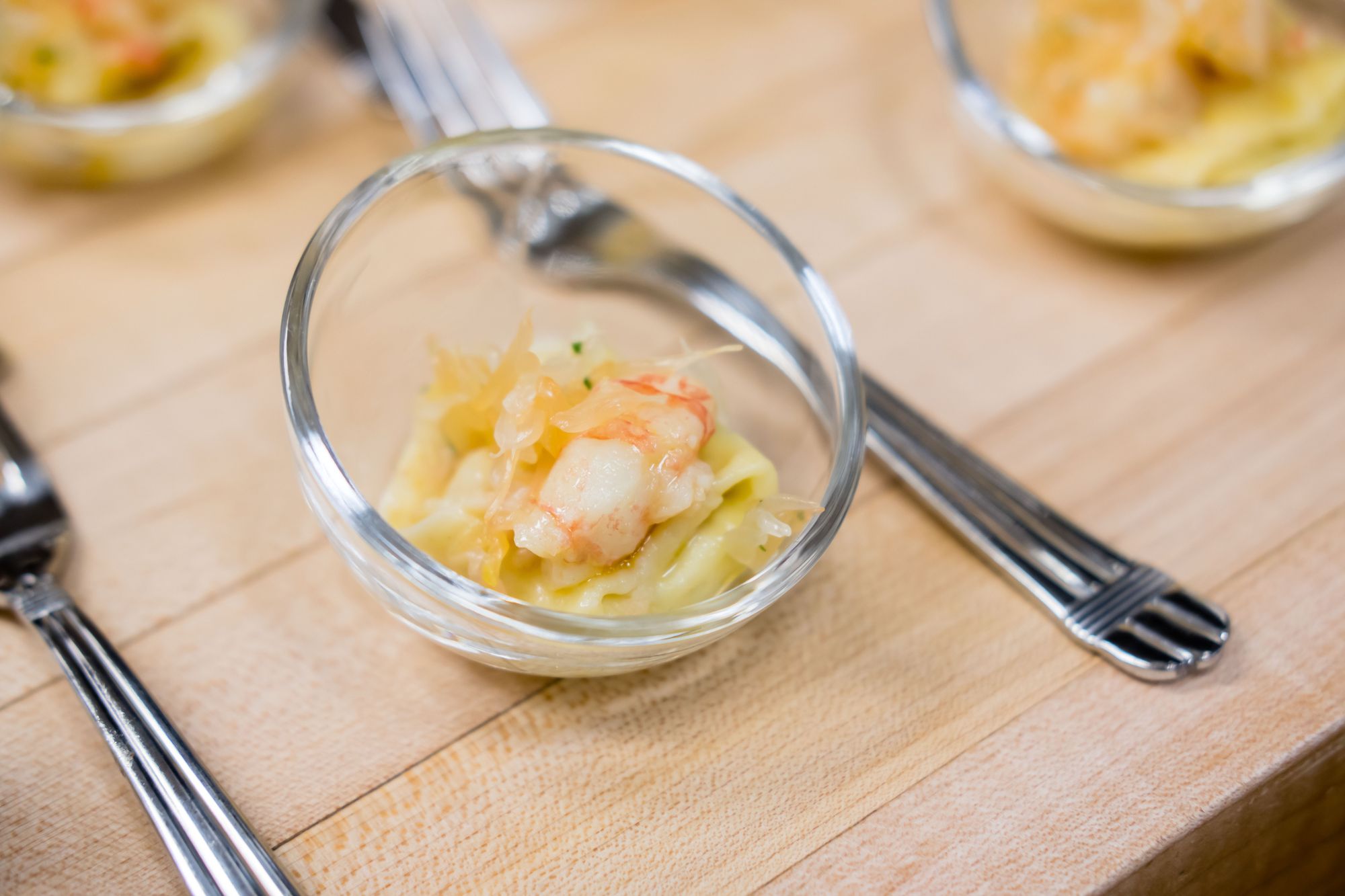Taking place in the same kitchen (this one was extra crowded) was a creation of BC Spot Prawn by the work of Chef Julian Bond. This was served with a ricotta tortellini, lemon verbena, and strands of pomelo. Each sample I took was very savoury and cooked just right. You know it's a good spot prawn by how tender the meat is (almost like a crab claw) and the tortellini was fun to slurp up.